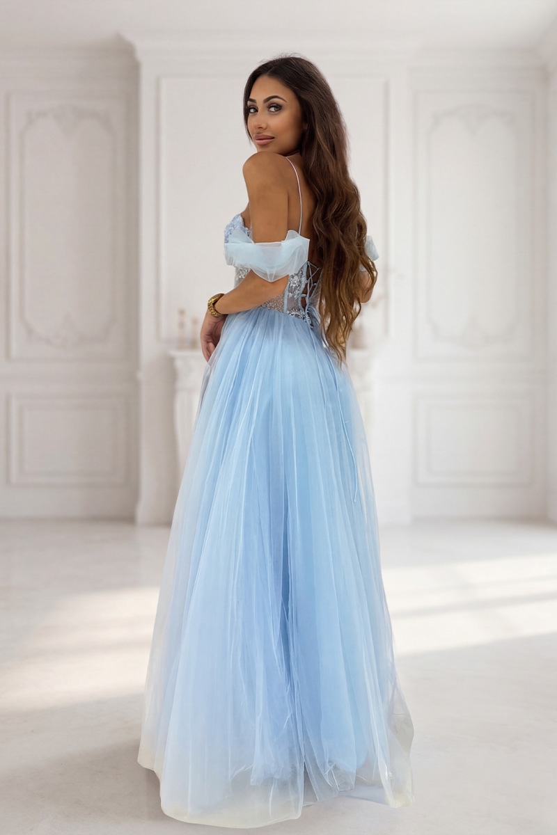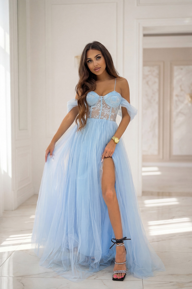 Luna helesinine kleit on romantiline ja pilkupüüdev valik erilisteks sündmusteks, kus soovid mõjuda naiselikult, elegantselt ja meeldejäävalt. Õhuline tüllseelik, korsettstiilis ülaosa ning õrn pitsiline viimistlus loovad luksusliku ja muinasjutulise üldmulje, mis püüab pilke igal sammul.